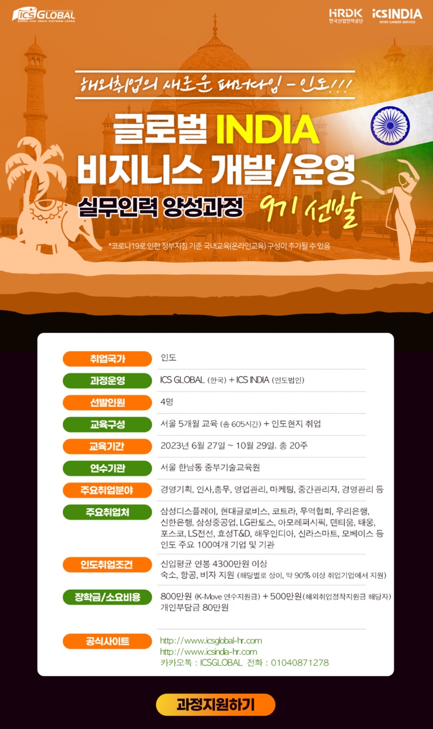 게시판 인도취업 2023년 정기 1차 한국산업인력공단 해외취업연수사업 2023년 정기 1차 한국산업인력공단 해외취업연수사업에서 인도 9기 과정 10명 승인을 받아 아래와 같이 연수생 모집 관련 내용 전달드립니다. 인도어전공2023. 5. 9조회수796 0 등록된 댓글이 없습니다. [(KOTRA 뉴델리&첸나이) 2…목록2023-1 특수외국어 전공 재학…