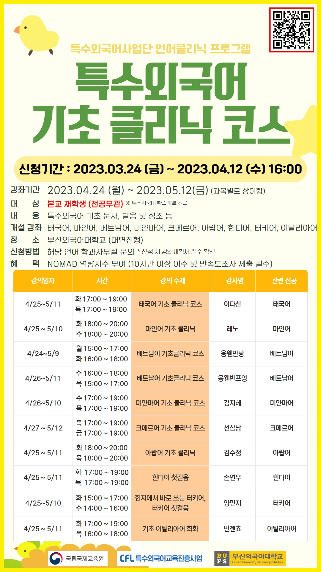 게시판 공지사항 [특수외국어사업단] 2023-1 특수외국어언어클리닉 홍보 및 모집 안내(기초클리닉 코스) 인도어전공2023. 4. 6조회수820 0 등록된 댓글이 없습니다. [특수외국어사업단] 2023-1 …목록